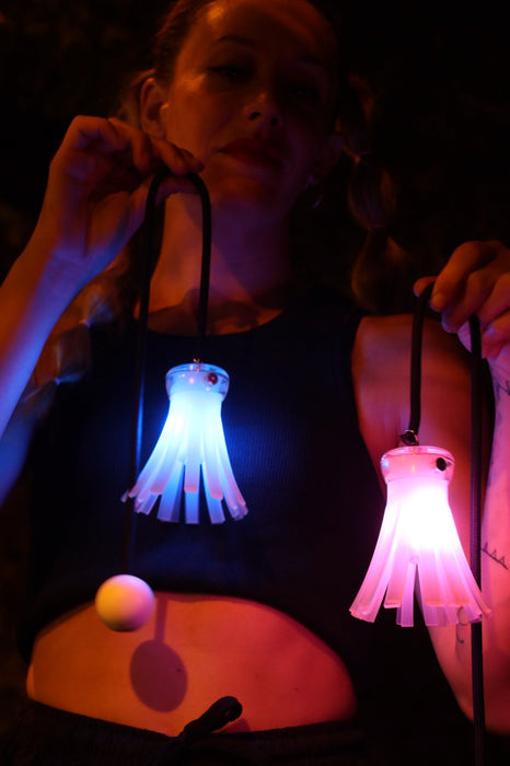 Chronos JS2 es la última versión de un Devil Stick de KOSMOS JUGGLING. Fabricado con un alma de Policarbonato, dos mangos de clava de luz para darle la forma cónica y recubierto en goma transparente para aumentar la fricción con las baquetas.