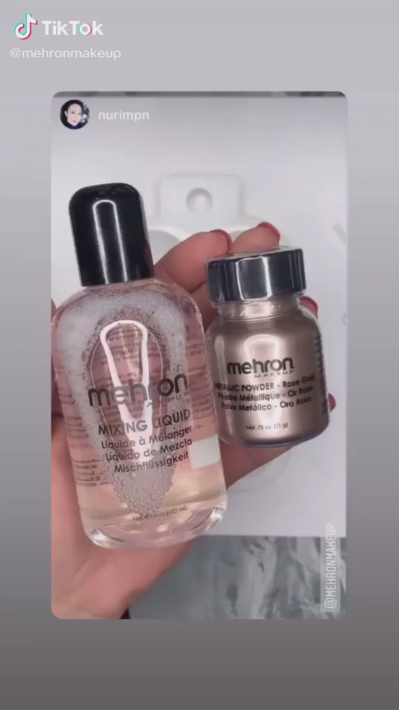 El polvo metálico de Mehron es un pigmento en polvo suelto ultrafino diseñado para crear diseños metálicos espectaculares y de alto brillo. Utilice el polvo suelto solo para crear suaves acentos metálicos o mézclelo con Mixing Liquid para transformar el polvo metálico en una pintura metálica líquida de larga duración y resistente a la transferencia. Al agregar Mixing Liquid, Metallic Powder se convierte en un intenso maquillaje líquido fundido que se puede pintar sobre el cuerpo o usar para crear diseños como delineador de ojos metálico.